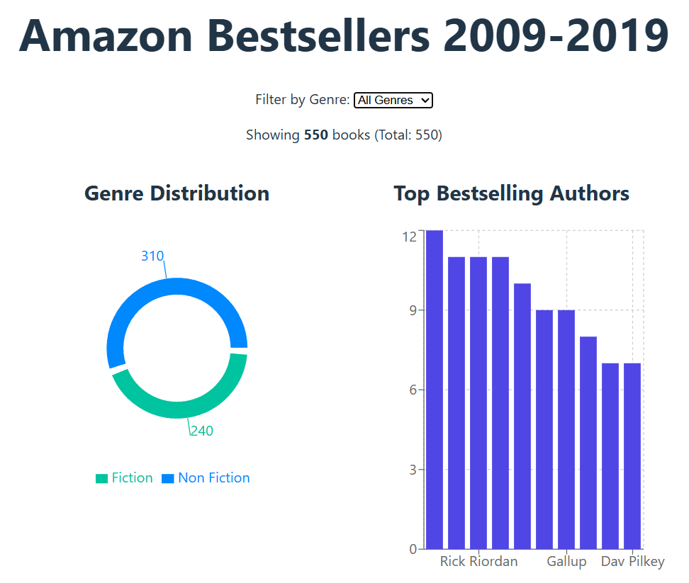The dashboard is starting to look great. You can filter the books and see the charts change right in front of you. I am planning to add a year slider next so you can look at specific time periods, like just the bestsellers from 2010 to 2012.